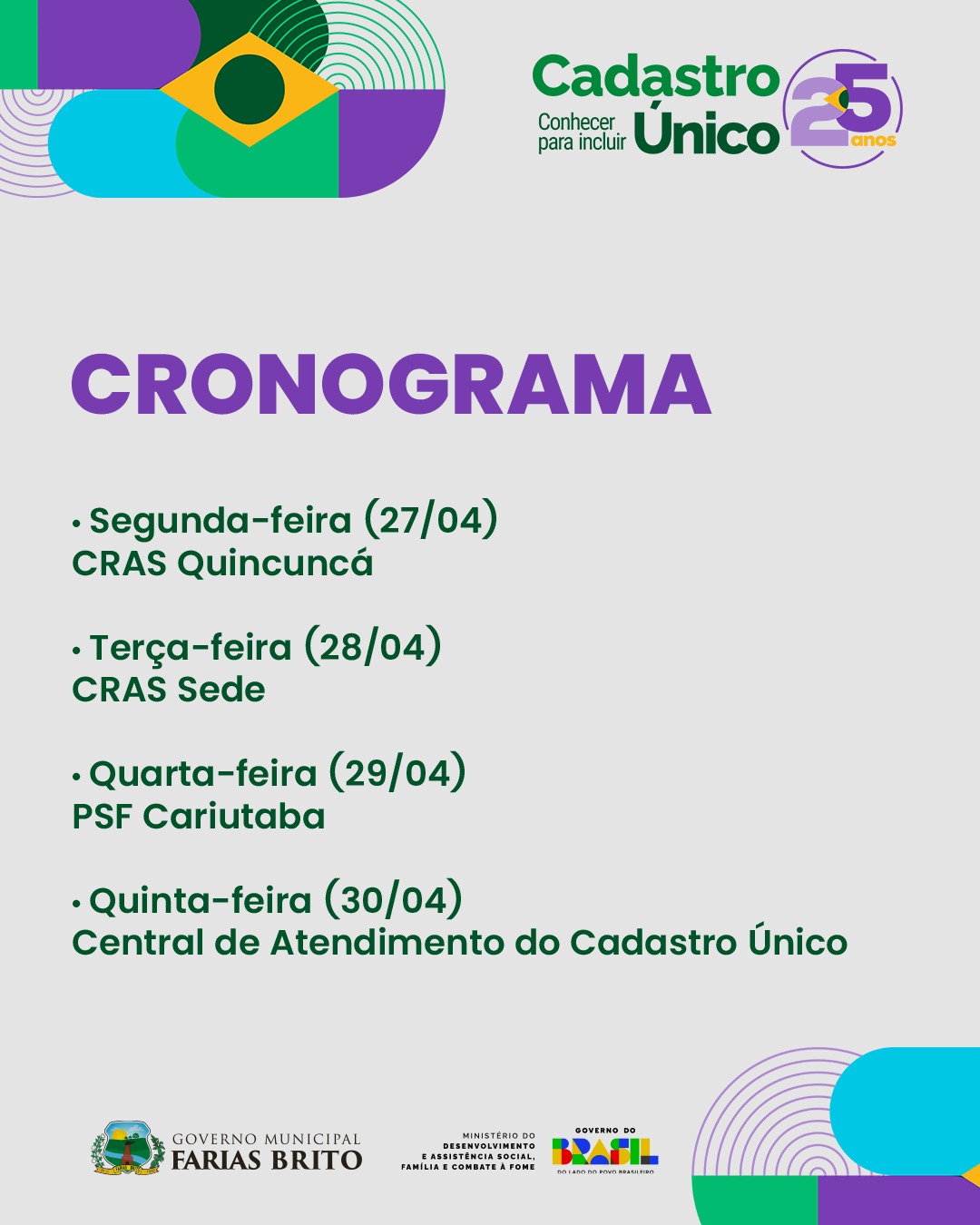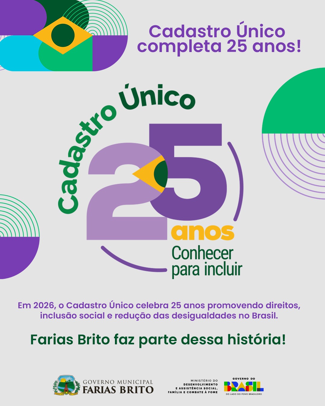Em 2026, o Cadastro Único para Programas Sociais do Governo Federal (Cadastro Único) celebra seus 25 anos de serviços prestados à sociedade brasileira, enquanto sistema público de informações que identifica e caracteriza a situação socioeconômica das famílias de baixa renda residentes em território brasileiro, alavancando a promoção de direitos e a redução das desigualdades no país. Conheça um pouco dessa história: Para marcar este importante momento da trajetória do Cadastro Único, o MDS organizou um conjunto de ações para o ano de 2026. CADASTRO EM AÇÃO Em comemoração aos seus 25 anos, foi realizada a mobilização nacional Cadastro em Ação que incentivou a realização de atividades em todo o país, reforçando a importância desse registro administrativo público junto à população. Como parte dessa iniciativa, a equipe do MDS acompanhou e registrou as atividades nas cinco regiões do Brasil, evidenciando a capilaridade e a força dessa rede construída de forma colaborativa. O município de Farias Brito , realizara uma semana de muitas ações, na sede e nos distritos durante a semana do dia 27 ao dia 30 de abril, com atendimento a vários públicos beneficiários do cadastro único, beneficiários do bolsa família, cartão mais infância, idoso, benefício de prestação continuada (BPC), para que possamos dar faciliadades aos mesmo, segunda-feira sera no CRAS QUINCUNCA, terca-feira no CRAS SEDE, quarta-feira no PSF de CARIUTABA e quinta-feira na CENTRAL DE ATENDIMENTO DO CADASTRO ÚNICO na sede do município.